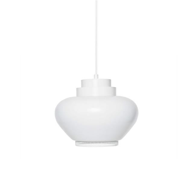 lampa wisząca A333 Turnip marki Artek charakteryzuje się organicznym i lekko zaokrąglonym kształtem, którego charakterystyczna sylwetka tworzy miękki i zachęcający nastrój, tworząc przyjemną atmosferę w pomieszczeniu. Zamknięty klosz kontroluje światło, zapewniając równomierne i spokojne oświetlenie, które doskonale sprawdzi się nad stołem w jadalni lub w salonie, gdzie liczy się atmosfera. Połączenie prostego kształtu i harmonijnego światła sprawia, że lampa idealnie nadaje się do wnętrz, w których pożądana jest zrównoważona i spokojna całość.