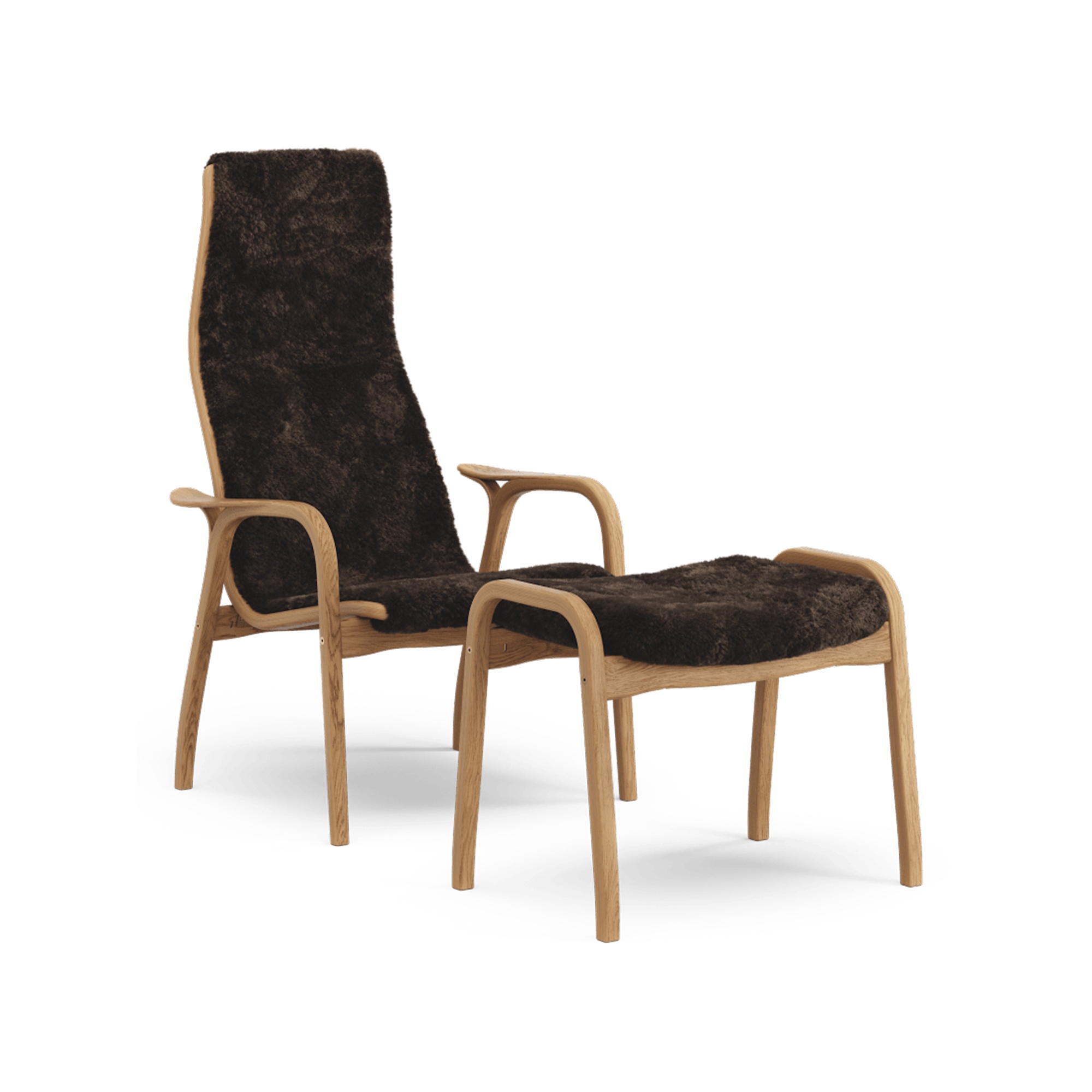 Fotel Swedese Lamino z podnóżkiem, dąb olejowany, kolor espresso, skóra owcza