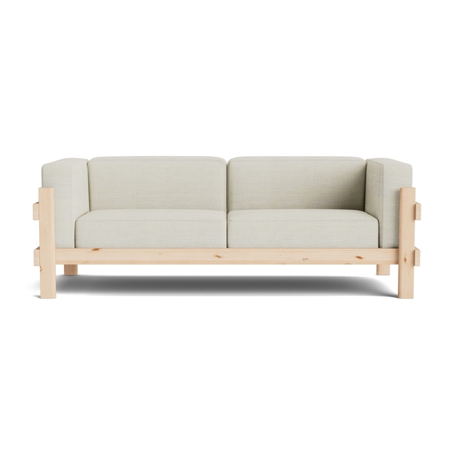 Sofa Kube łączy w sobie kubistyczną prostotę z miękkim komfortem, tworząc harmonijną całość z tradycjami połowy XX wieku i nowoczesną estetyką. Uderzająca, lita sosnowa rama ma niemal brutalistyczny charakter, który łagodzą luźno ułożone poduszki na siedzisku, oparciu i podłokietnikach, nadając sofie relaksujący i zachęcający wygląd. Otwarta, drewniana konstrukcja podkreśla kunszt wykonania i piękne łączenia, gdzie mocne deski łączą się w niemal rzeźbiarską całość. Naturalna struktura i ciężar drewna przyczyniają się do trwałości i charakteru, a z czasem pokryją się piękną patyną.